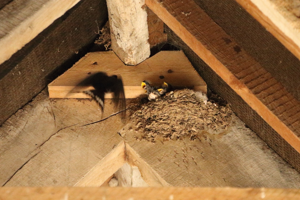 There are three swallow chicks in this nest and there might be a fourth but it is difficult to capture (the shot).  Both parents are feeding the young but which is the male and female?